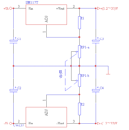 CW137为三端可调负输出集成稳压器,输出电压可调范围为-(1.2—37V),输出电流可达1.5A。其1脚为调整端,2脚为输入端,3脚为输出端。